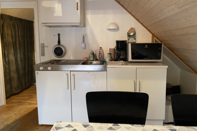 Lejligheden på 1. sal indeholder rummelig opholdsstue med trægulve og synlige bjælker, åbent tekøkken, badeværelse med brus og rummeligt soveværelse.