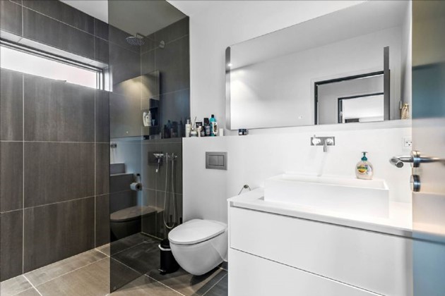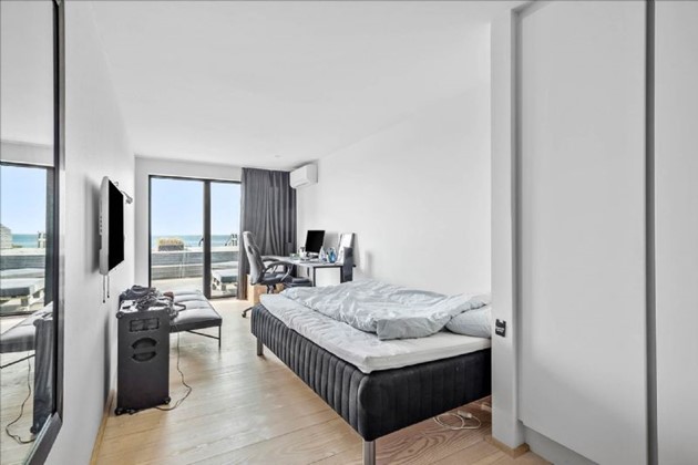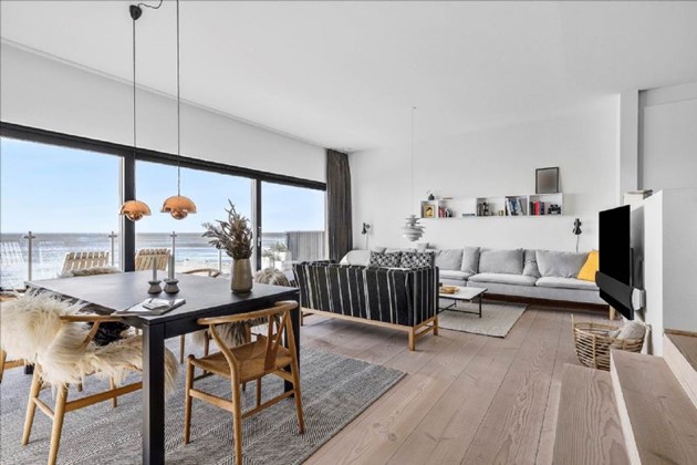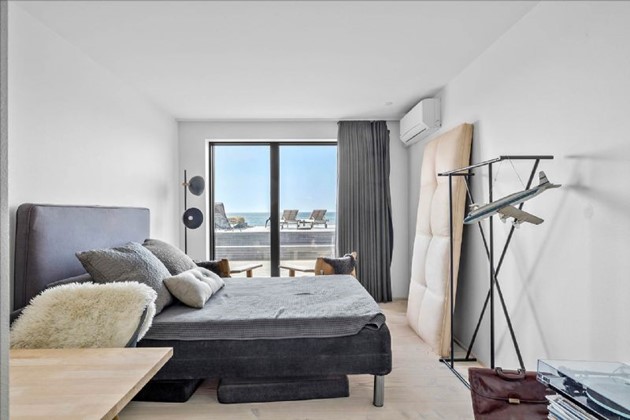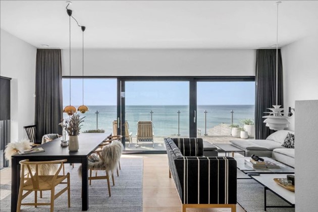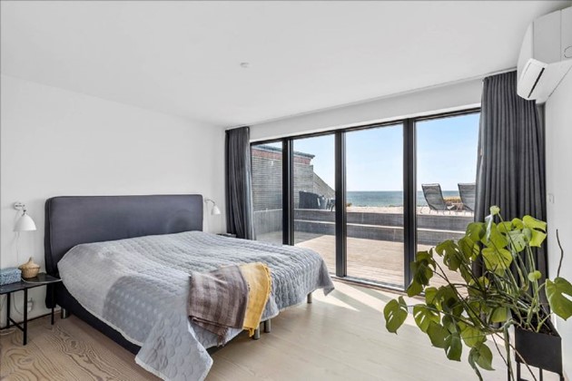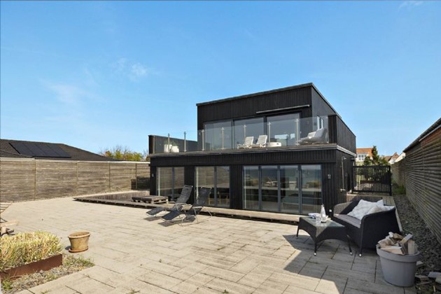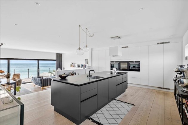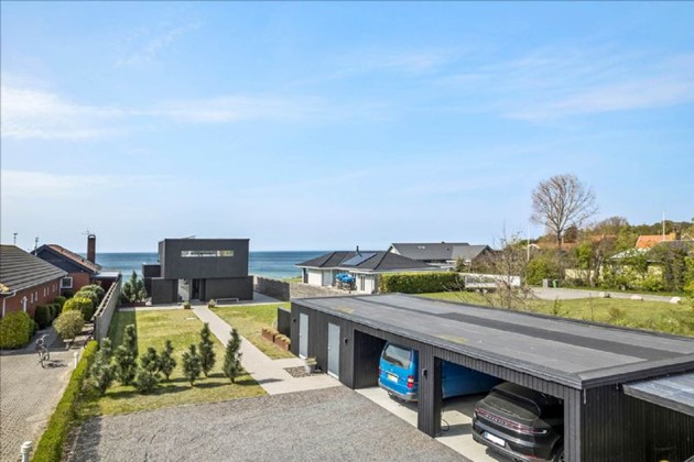 Den stilrene sortmalede trævilla på 204 m² fremstår i topstand og er opført i kubistisk design med indskudte etager og store vinduespartier, der inviterer havudsigten helt ind i boligen. Uanset om man befinder sig i stue, køkken, badeværelse eller på en af de mange terrasser, er der frit udsyn til vandet – og til solnedgange, der kan tage pusten fra én.