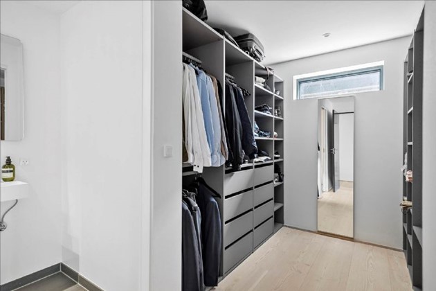 Indretningen er gennemtænkt med fokus på lys, funktionalitet og æstetik. Boligen rummer bl.a. entré med gæstetoilet og trappe til stuen, værelsesafdeling med to værelser og badeværelse, separat forældreafdeling med walk-in closet og eget bad, stort køkken-alrum med vinkøleskab og kvalitetsmaterialer, samt en hyggelig stue i forskudt plan med direkte adgang til terrasse og havudsigt.