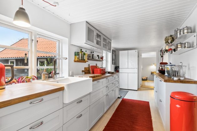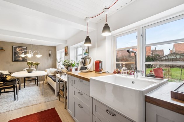 Huset udstråler charme både indendørs og udendørs, og de seneste år har set flere væsentlige forbedringer, der har forhøjet boligens værdi og komfort. Hjertet i hjemmet er det rummelige opholdsrum, hvor stue og køkken smelter sammen i en åben og indbydende planløsning. Køkkenet, renoveret i december 2020, er en moderne drøm med lysegrå skuffemoduler og en lys bordplade, der sammen skaber et skarpt og stilrent design. En særlig charme tilføjes af de blotlagte bjælker under loftet og det dejlige lysindfald fra de sprossede vinduer.