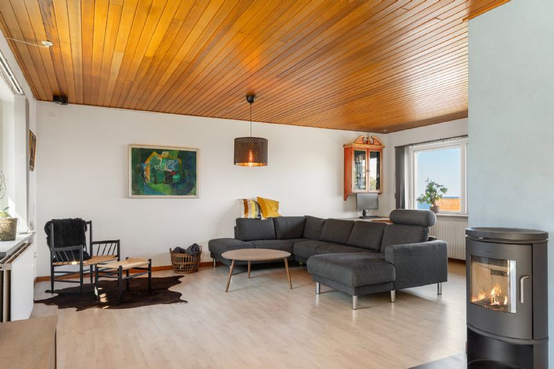 Villaen byder på fire værelser, badeværelse fra 2010, gæstetoilet og et nyere køkken fra 2019, der er åbent mod stuen med spiseplads og brændeovn.