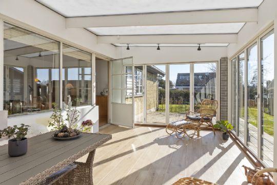 Udestue samler hjemmetUdestuen er et centralt element i boligen. Med store glaspartier fra gulv til loft trækkes haven helt ind i huset, og rummet fungerer som et naturligt samlingspunkt.