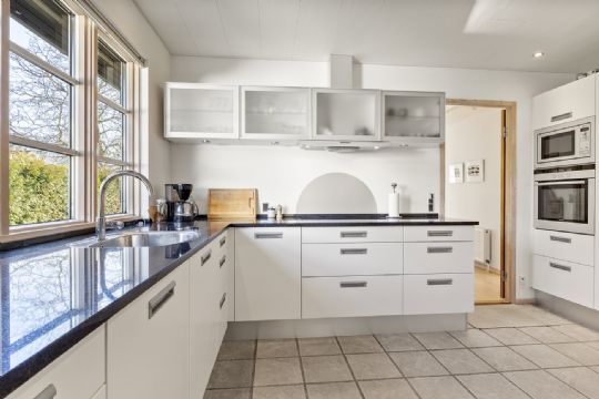 Køkkenet fremstår lyst med hvide fronter og har god plads til både madlavning og et mindre spiseområde. Derudover er der adgang til bryggers.