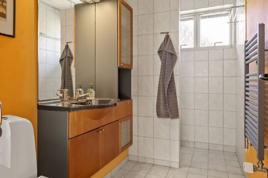 Praktisk indretningPlanløsningen er klassisk og funktionel. Fra entréen er der adgang til fordelingsgang med tre regulære værelser, hvoraf to har indbyggede skabe.