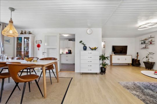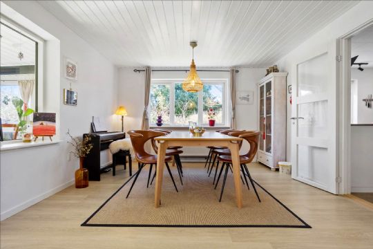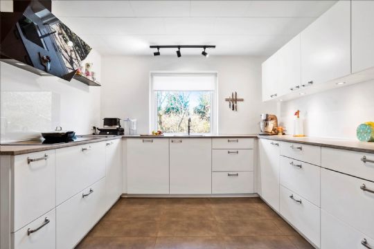 Køkkenet er opdateret i 2022 i et stilrent, hvidt design med moderne hvidevarer og Quooker. Derudover er der en skøn udestue med direkte adgang til en sydvendt træterrasse fra 2025.