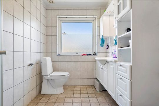 Foto: EDC BornholmerBoBadeværelset fremstår pænt og velholdt med gulvvarme, mens boligens hjerte er den store vinkelstue med god plads til både ophold og spisning.