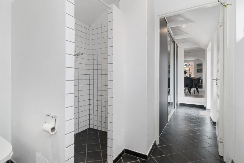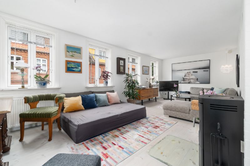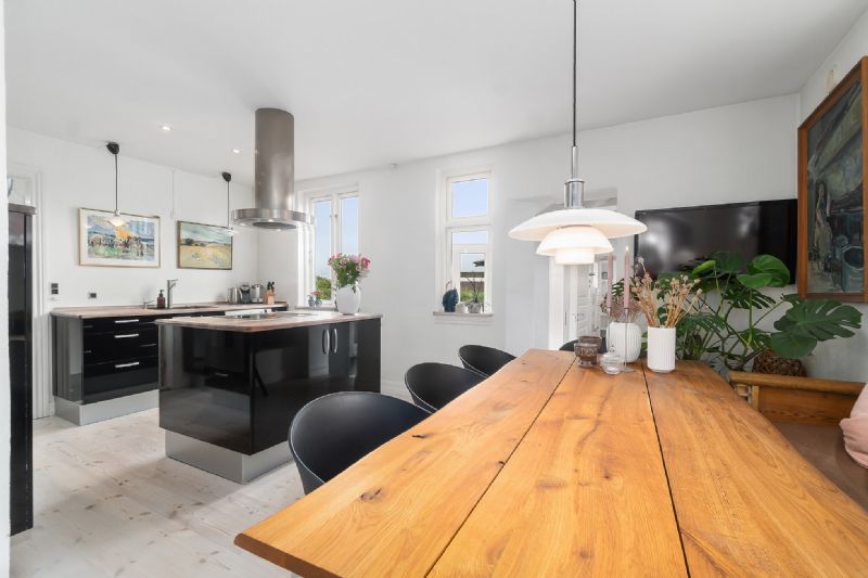 Det centrale omdrejningspunkt er køkken-alrummet og stuen, der adskilles af en bred hvælving. Det flotte, gennemgående trægulv sikrer en stilmæssig, rød tråd, mens vinduespartierne understreger den lyse atmosfære. Køkkenet er udført med sorte elementer, der står i flot kontrast, og stuen prydes af en brændeovn.