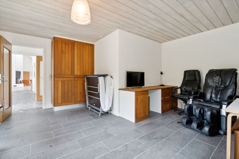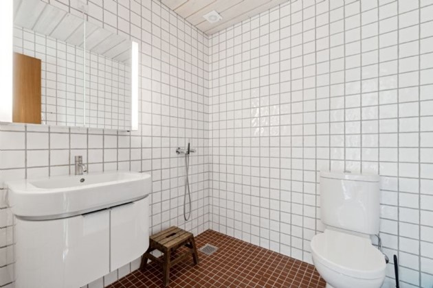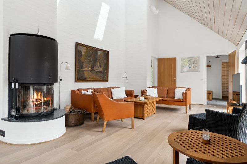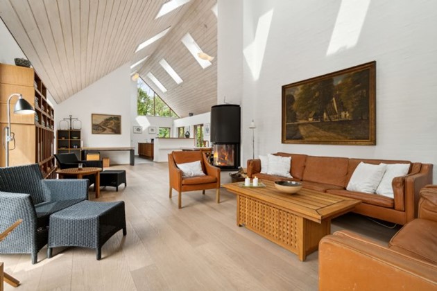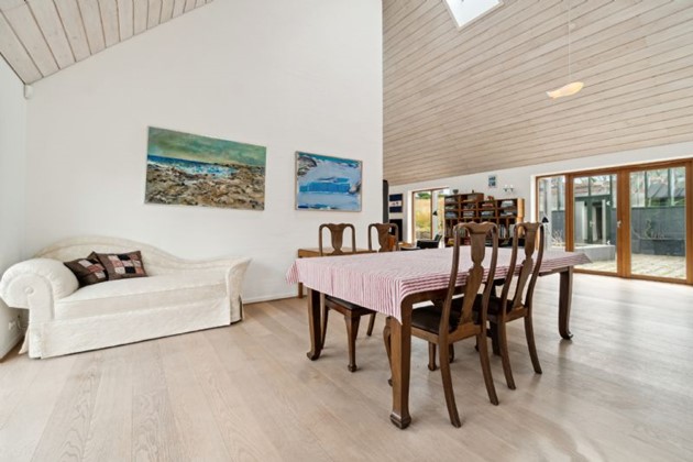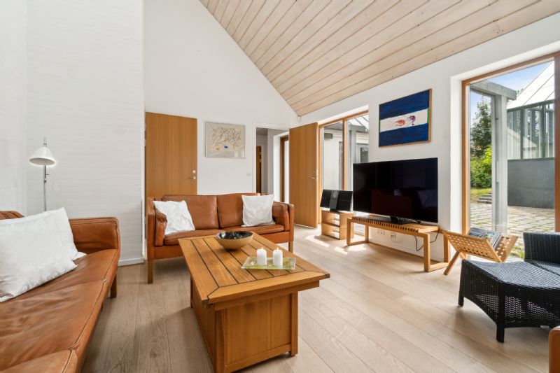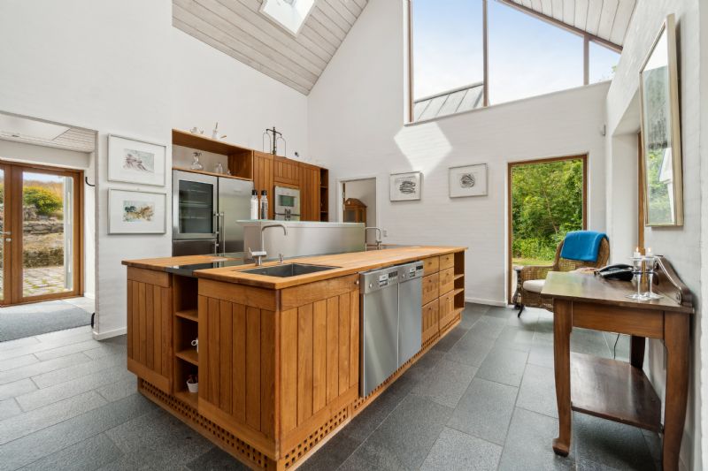 Indendørs byder ejendommen på mange detaljer. Entréen har et imponerende gulv, der repræsenterer hver eneste af Bornholms granittyper, og leder videre til det store opholdsmiljø med omkring seks meter til kip, pudsede murstensvægge og ovenlysvinduer. Køkken-alrummet udstråler kvalitet med flotte træelementer, en køkkenø og førsteklasses hvidevarer. Alrummet og stuen er rummelige og lyse, hvilket skaber en indbydende atmosfære.