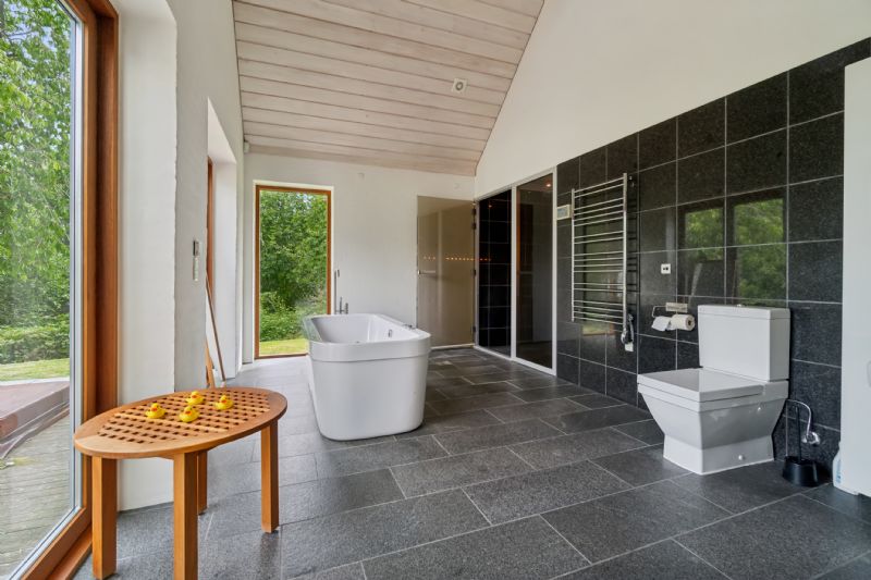 Udendørsområderne er fremragende, med dejlige terrasser omkring huset, herunder en stor terrasse med udespa, hvorfra man gennem træerne kan nyde udsigten over vandet. Den private adgang til havet giver eksklusive forhold og mulighed for at spejde mod Christiansø. På grunden er der også en garage og et rummeligt orangeri med mange anvendelsesmuligheder.