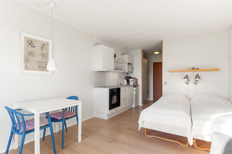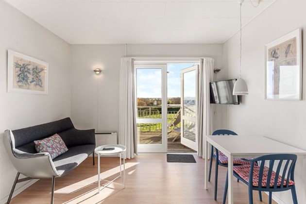 Feriebolig med ro og udsigtBoligen byder på et enkelt og funktionelt indrettet opholdsrum, hvor køkken og stue er samlet i ét. De lyse overflader og det gode lysindfald skaber en afslappet stemning – perfekt til dage med ro, læsning eller spil efter ture på øen.