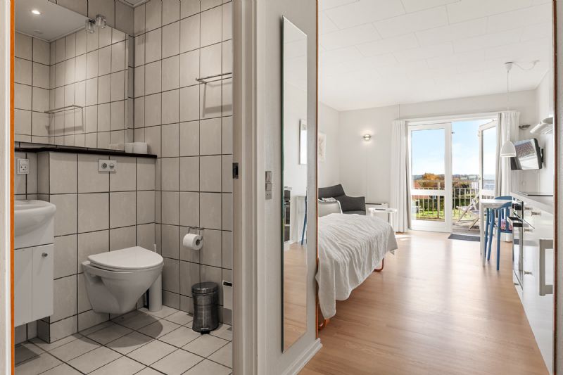 Praktisk og let at holdeBadeværelset ligger lige ved indgangen og rummer alt det nødvendige til en ubesværet feriehverdag. Boligens størrelse og indretning gør den nem at holde – ideel til både korte ophold og længere ferier.
