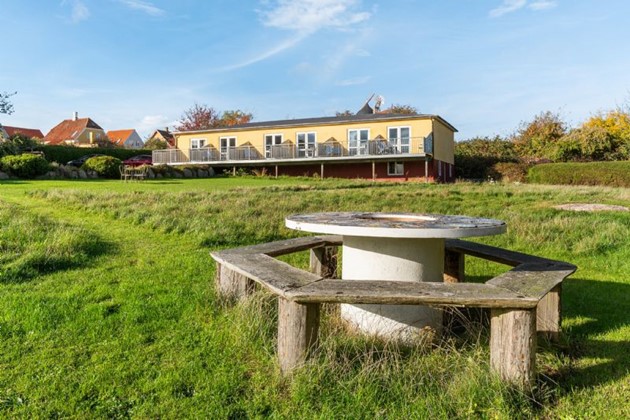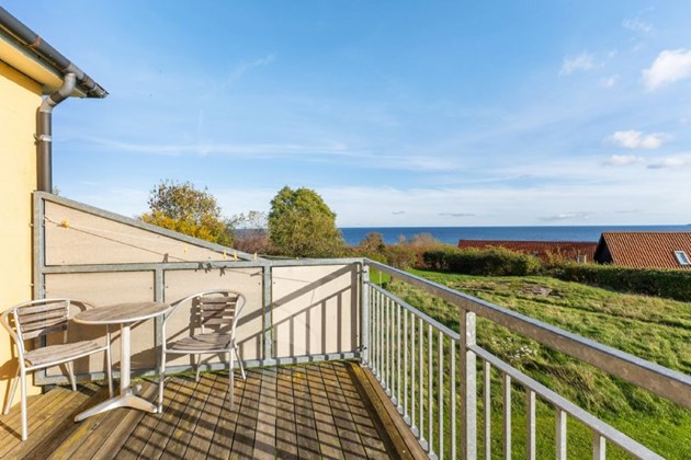 Terrassen med udsigtFra terrassen er der kig til havet og grønne omgivelser, og her kan dagen begynde med en kop kaffe i morgensolen eller afsluttes med udsigten til det blå.