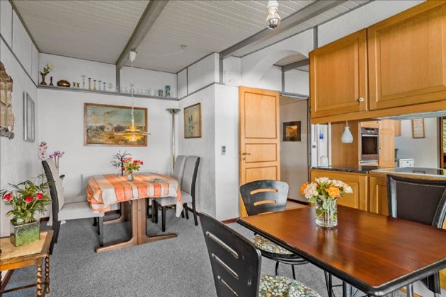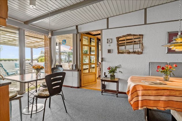 Villaens indretning byder på en rummelig entre, to værelser, heraf et med eget toilet, og et badeværelse med muret bruseniche. Det store køkken/alrum har en fantastisk havudsigt og udgang til en delvist overdækket terrasse, mens den lyse stue med pejs og glasparti åbner op mod terrassen og den storslåede have. Derudover er der en udestue med grill-plads, et værksted, udhus og en carport.