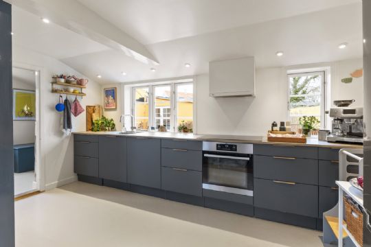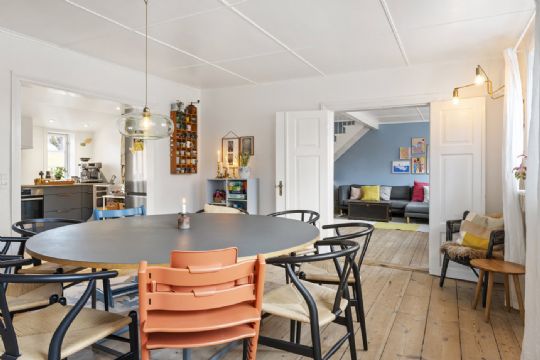 De gamle plankegulve bidrager til husets særlige atmosfære, mens køkkenets ekstra loftshøjde og mørke elementer giver rummet karakter og et moderne udtryk.