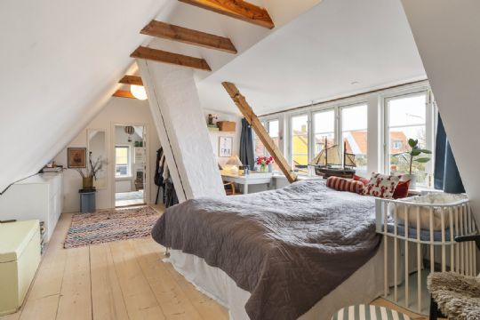 Udsigt over hustage og havFørstesalen er gennemgribende istandsat med flotte trægulve og en stor kvist, der giver et smukt kig over Svanekes karakteristiske hustage og ud mod Østersøen. Her finder man et rummeligt soveværelse og endnu et værelse, der kan indrettes efter behov.