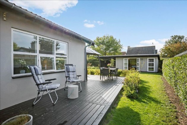 Grunden er på 611 m², anlagt med flisebelagt indkørsel til carport, lille forhave med græsplæne og diverse beplantning, samt hyggelig og aflukket have med græsplæne, diverse beplantning, overdækning, "anneks/udhus" samt stor træterrasse, hvor der er sol det meste af dagen.