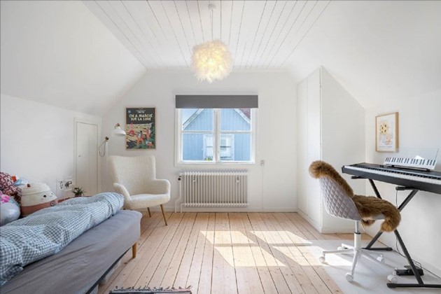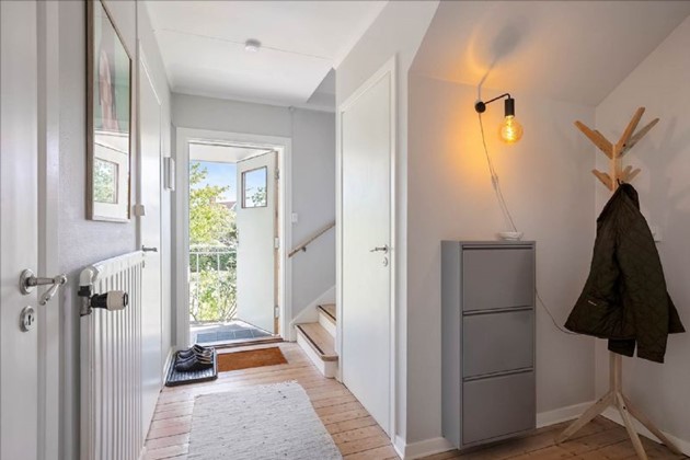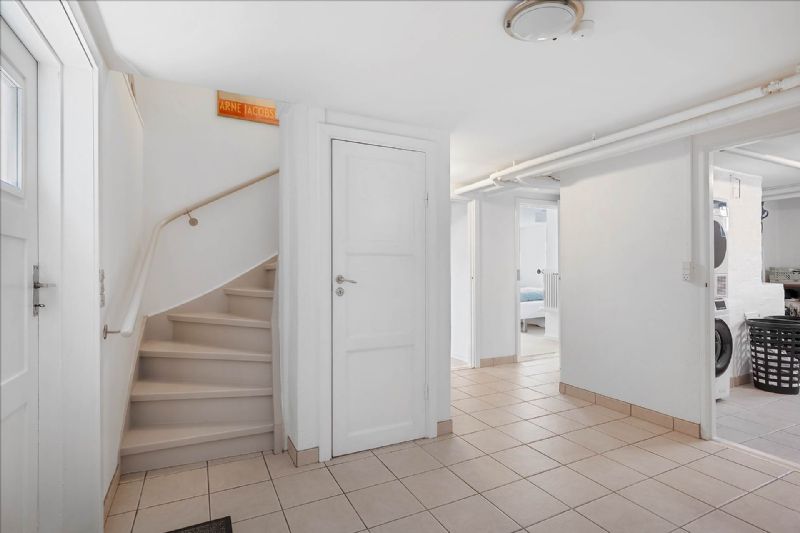 På førstesalen er der et repos samt to gode værelser, hvoraf det ene fungerer som soveværelse med indbyggede skabe. Begge rum har et skønt lysindfald. Kælderen rummer yderligere en entre med adgang til to disponible rum samt et praktisk vaskerum med vaskemaskine og tørretumbler. Der er også et fyrrum med fjernvarmeunit.
