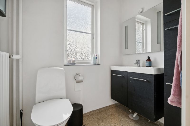 Badeværelset i kælderen er lavet i 2022 og er udstyret med gulvvarme, en muret bruseniche samt et Grünbeck-blødgøringsanlæg.