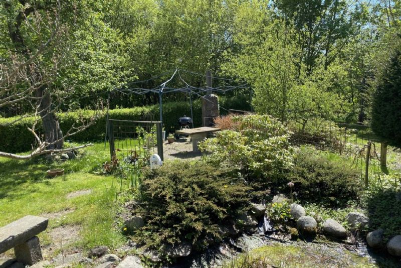 Vinkelhuset har udhus, carport og parklignende have med frugttræer og lille dam.