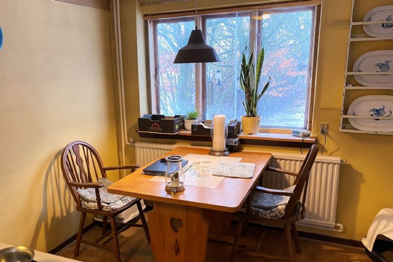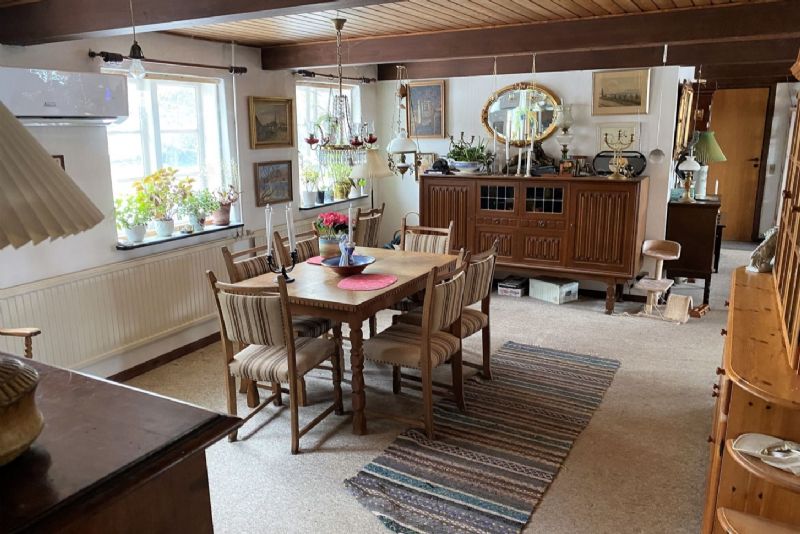 Huset indeholder entre, tre værelser, feststue, stor stue med el-varmepumpe, soveværelse, hverdagsentre, baderum med plads til vaskemaskine, separat toilet med håndvask samt spisekøkken og fyrrum med pillefyr med stoker.