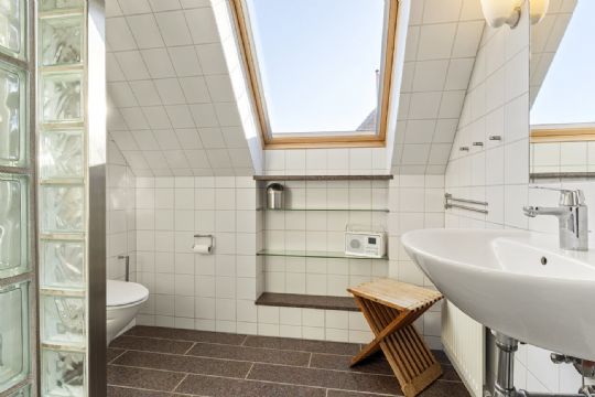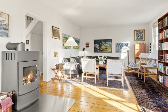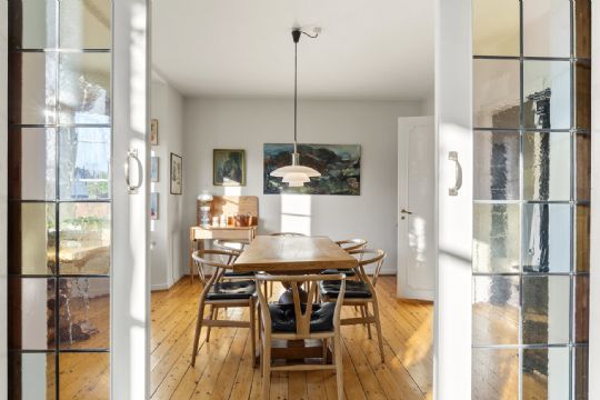 Klassisk – men opdateretDe originale detaljer er bevaret, men boligen er samtidig moderniseret med respekt for helheden. Køkkenet er udskiftet til et grebsløst, tidløst design, der lader de arkitektoniske elementer stå frem. Bryggers, bad og toilet fremstår enkle og funktionelle – med fokus på hverdagskomfort.