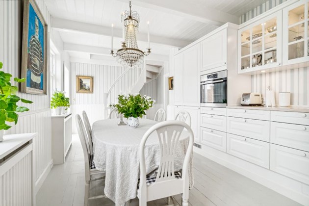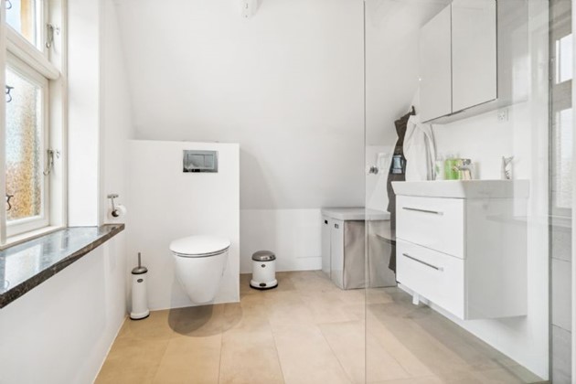 Inden døre afslører byhuset en smagfuld indretning, der elegant forener klassiske og nutidige elementer. Stueetagen byder på et rummeligt køkken-alrum og en stue, udstyret med en svensk kakkelovn, der tilføjer et hyggeligt og varmt element til rummet. Denne etage er hjertet af hjemmet, hvor familie og venner kan samles og nyde hinandens selskab.
