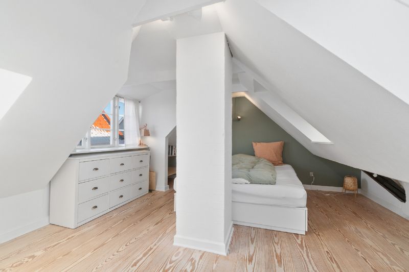 Opdateret første salPå omtrent samme tid som køkkenet blev opgraderet, blev der lagt gulv på førstesalen, hvor der er en skøn soveafdeling. Skråvæggene bidrager til en virkelig hyggelig stemning.