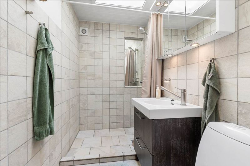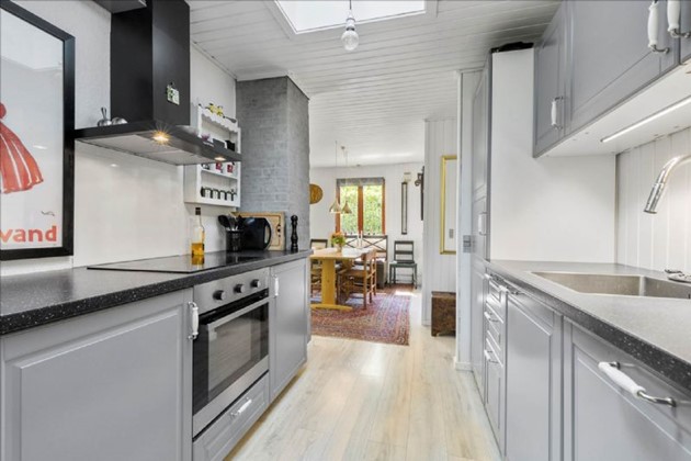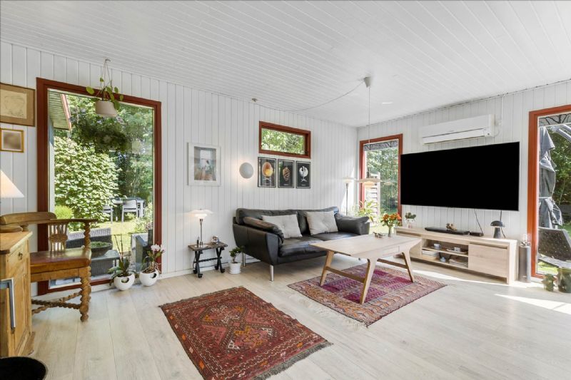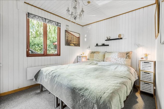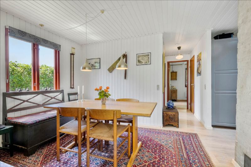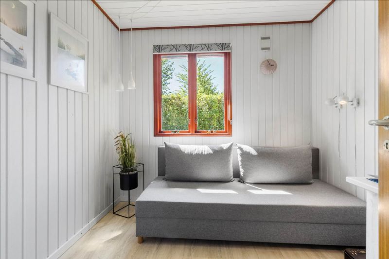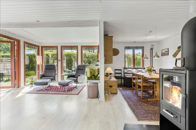 Indendørs byder sommerhuset på en praktisk indretning med et bryggers udstyret med vaskemaskine og tørretumbler, et soveværelse med tilhørende walk-in closet, et ekstra værelse, og et badeværelse med bruseniche, håndvask, toilet og ovenlysvindue, som giver et dejligt lysindfald. Den åbne køkkenafdeling har diverse hvidevarer og god plads til en spiseafdeling, også her med dejligt lys fra ovenlysvinduet. Stuen er udstyret med en brændeovn og udsigt til den ugenerede have.