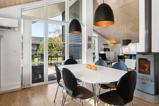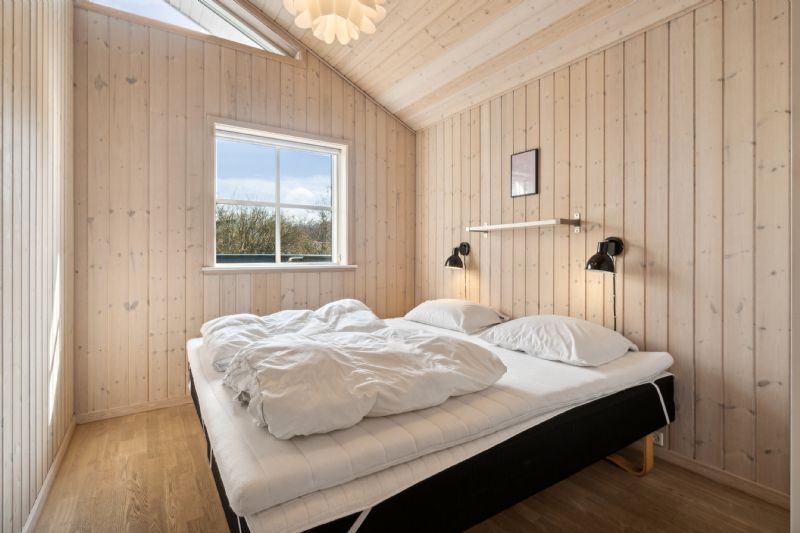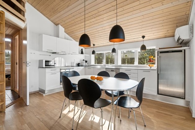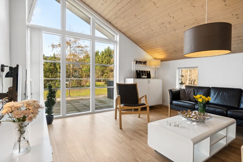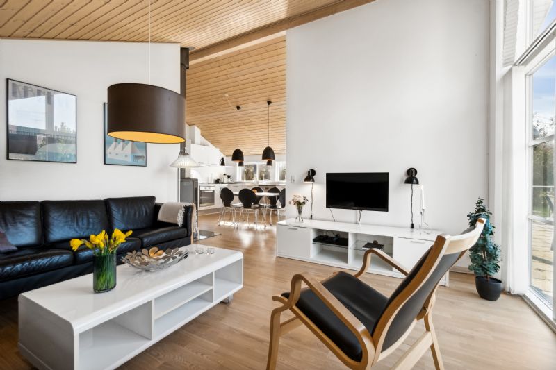 Indendørs byder sommerhuset på en åben planløsning mellem køkkenet og stuen, hvor loft til kip og store vinduespartier sikrer et fantastisk lysindfald og en følelse af rummelighed. Trægulvene gløder i sollyset, og indretningen inviterer til både hyggelige middage og afslappende stunder i de bløde møbler.