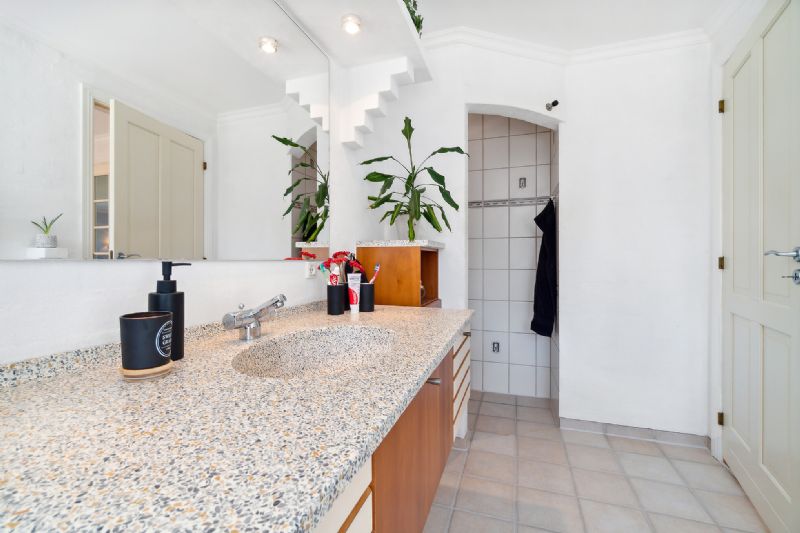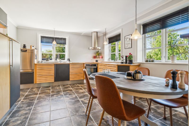Samlingspunktet er det store opholdsmiljø med åben forbindelse mellem stuen og køkkenet, hvilket skaber en luftig rumfornemmelse, som forstærkes af lysindfaldet fra de tre verdenshjørner.
