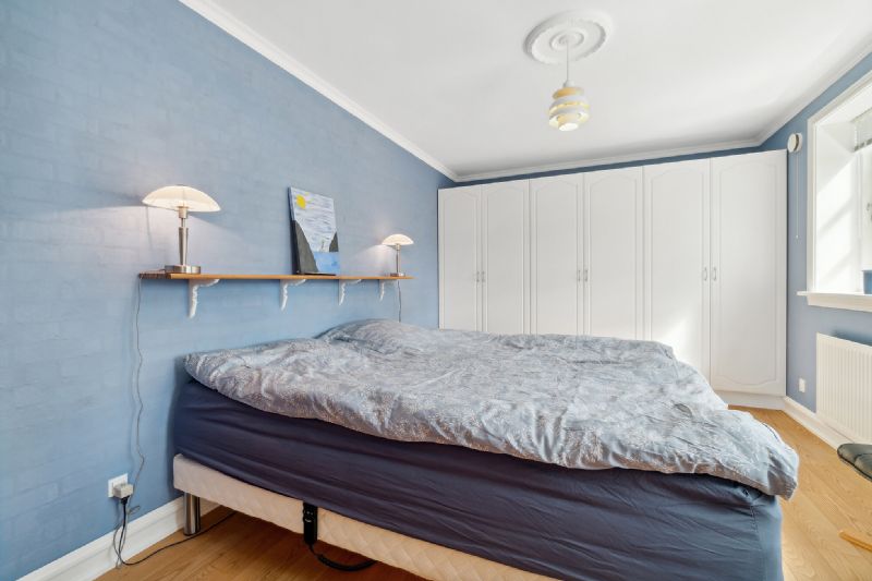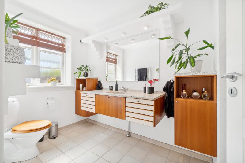 Køkkenet har en hyggelig spiseplads, og stuen har en karnap med udgang til solrig træterrasse. Videre rummer stueetagen et praktisk bryggers, et flot badeværelse og et stort soveværelse.