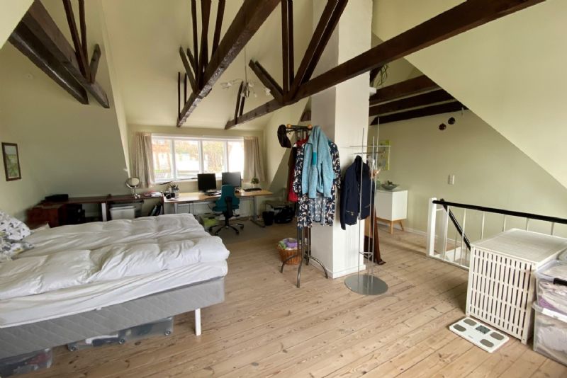 På 1. sal er der soveværelse med loft til kip, synlige bjælker og pragtfuld udsigt.