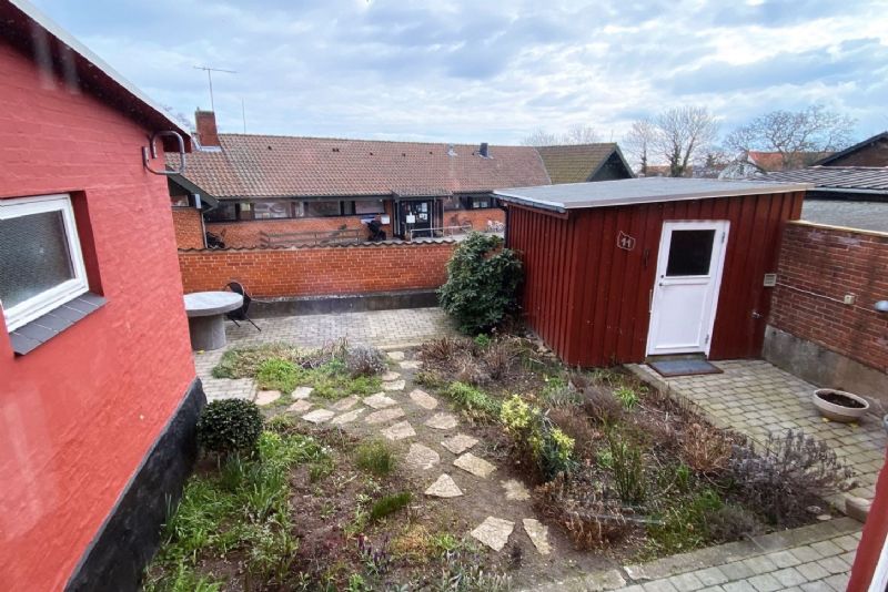 Der er en skøn gård med terrasse, buske og praktisk isoleret udhus.