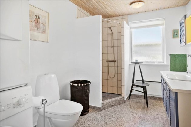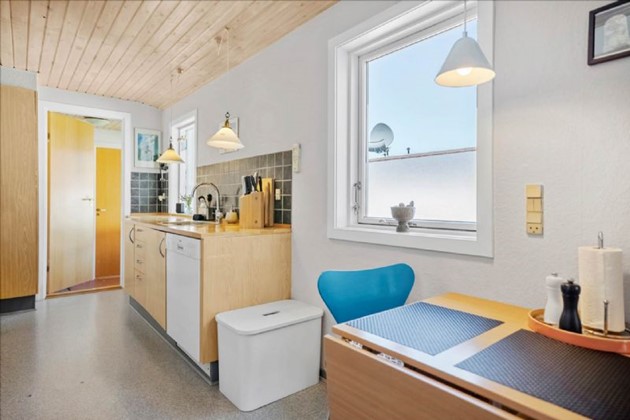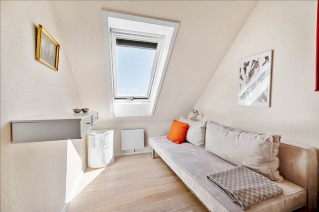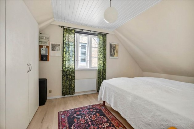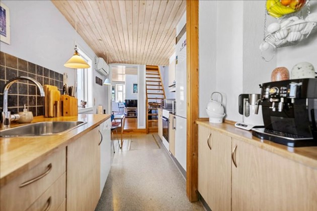 På første sal, der fremstår lys og indbydende, er der repos med skabe, et værelse og et soveværelse. Dertil kommer en lille kælder og to udhuse med god plads til værksted eller opbevaring.