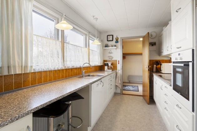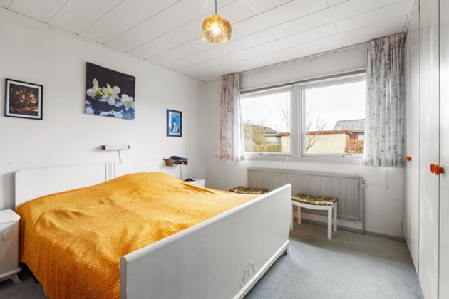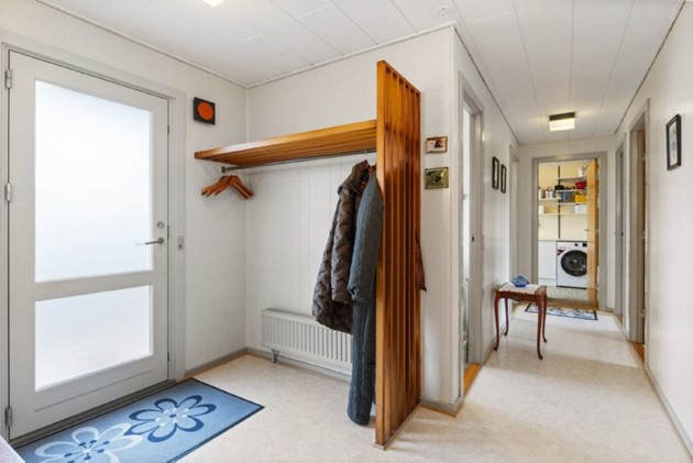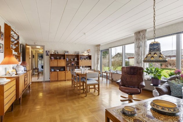 Villaen har en veldisponeret planløsning, der er typisk for 1970’erne, med en adskilt opholds- og soveafdeling. Huset indeholder en entré, en fordelingsgang, tre værelser, to badeværelser og et praktisk bryggers. Køkkenet er funktionelt indrettet og har gode opbevaringsmuligheder, mens den rummelige opholdsstue med fletparket og store vinduespartier er hjemmets naturlige samlingspunkt. Fra stuen er der direkte udgang til den sydvendte terrasse, der giver mulighed for at nyde solen det meste af dagen.