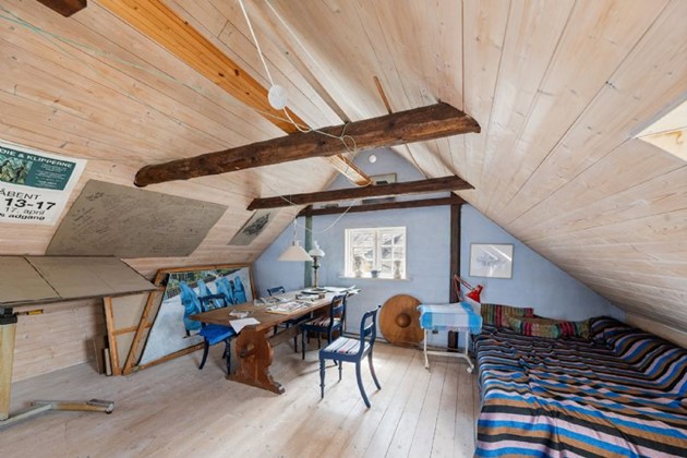 Indretningen er fleksibel og inviterer til kreativ udfoldelse. I stueplan smelter køkken og opholdsstue sammen i ét stort leverum, hvor der er plads til både hverdag og gæster. Øverste etage byder på et åbent rum med direkte adgang til altanen – ideelt som atelier, multirum eller soveafdeling. Et ekstra, disponibelt rum fungerer i dag som værksted og rummer mange anvendelsesmuligheder.
