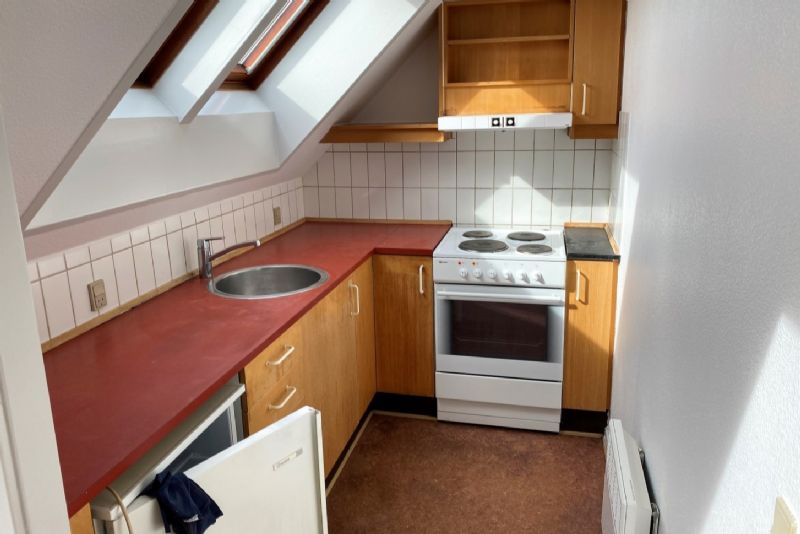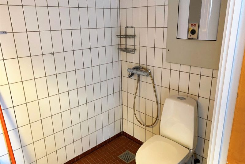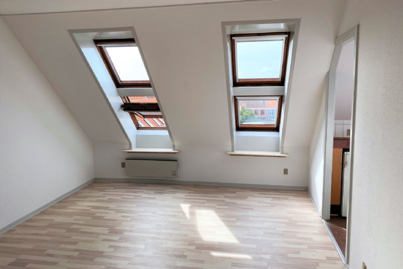 Lejligheden indeholder entre, badeværelse med brus. soveværelse med skabe, tværgående stue med godt lysindfald og køkkenafsnit.