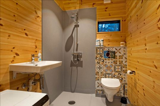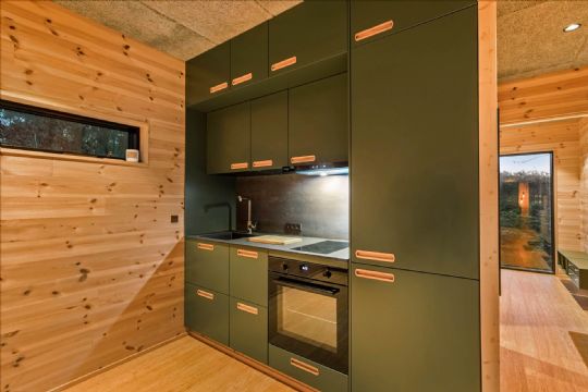 Indvendigt er huset indrettet, så kvadratmeterne udnyttes optimalt. Den kombinerede stue og køkken fungerer som boligens samlingspunkt og fremstår lyst og åbent med store vinduespartier, der lukker naturen helt ind. Derudover rummer sommerhuset et separat soveværelse samt et praktisk badeværelse med toilet og bruser.