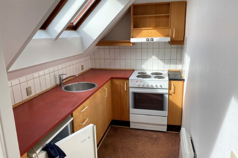Lejligheden indeholder entre, badeværelse med brus, soveværelse med skabe og tværgående stue med godt lysindfald samt køkkenafsnit.