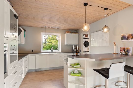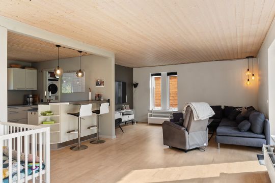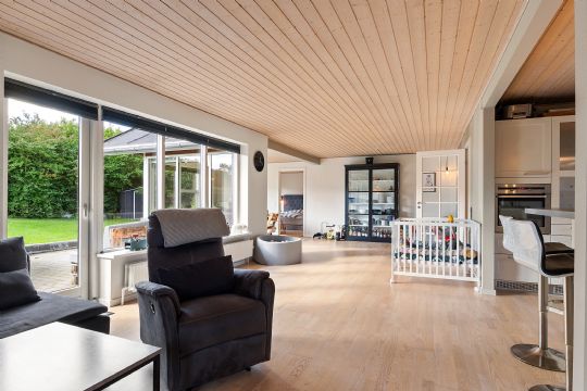 Åbent opholdsmiljø med masser af lysBoligens naturlige samlingspunkt er det store og lyse stuemiljø, hvor opholdsstue, alrum og køkken smelter sammen i ét åbent rum. Store panoramavinduer mod haven giver et flot lysindfald og skaber en luftig atmosfære, der fungerer lige godt til hverdagens rutiner som til større sammenkomster og festlige lejligheder. Planløsningen rummer desuden tre værelser, som gør villaen velegnet til familien.