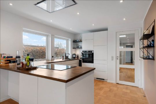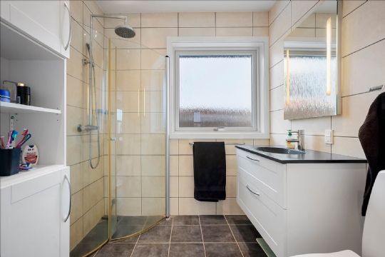 Foto: EDC BornholmerBoBoligens hjerte er det åbne køkken-alrum med spiseplads, gulvvarme og indbyggede spots. Herfra er der via dobbelt glasskydedør adgang til en lys stue med direkte udgang til en hævet fliseterrasse. I stueplan findes desuden et stilrent gæstetoilet med gulvvarme og messingdetaljer, et badeværelse med bruseniche og gulvvarme, et stort soveværelse samt tre gode børneværelser. Entréen byder på garderobeafsnit og ovenlysvindue, som sikrer et flot lysindfald, og herfra er der trappe til kælderen.