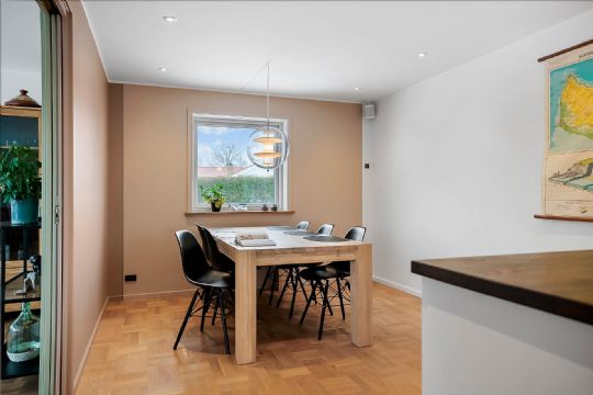 Ejendommen er opført i 1965, men de seneste års modernisering har givet boligen et nutidigt og ensartet udtryk. Stueplan fremstår med gennemgående flotte gulve, og huset præsenterer sig pænt med pudsede og malede facader, sortmalet eternittag og hvide vinduer.