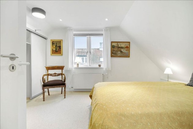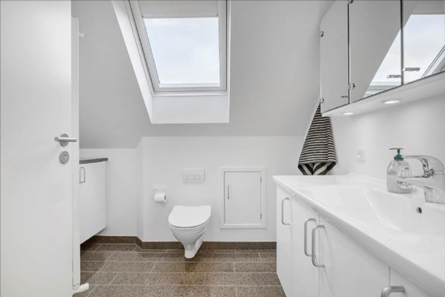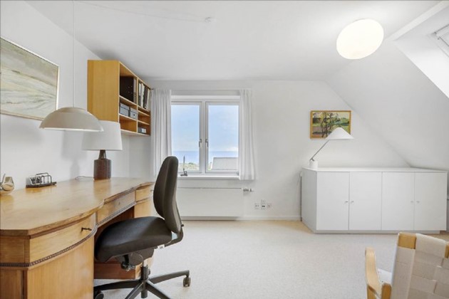I en lavere etage fra entre er et stilfuldt badeværelse, et stort værelse (nuværende anvendt som kontor), og en mellemgang med adgang til første sal, som rummer et stort møblerbart repos, to store værelser med praktiske skabsvægge, og et elegant toilet med håndvask og spejlarangement.