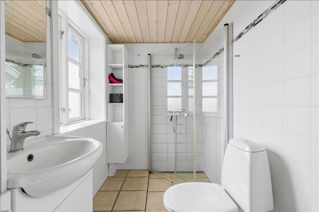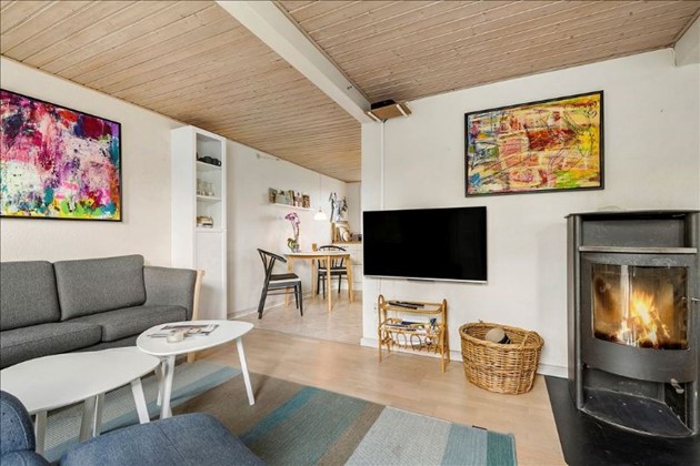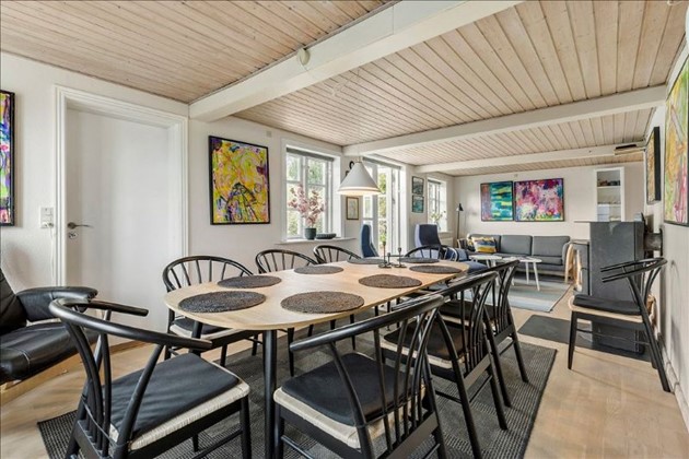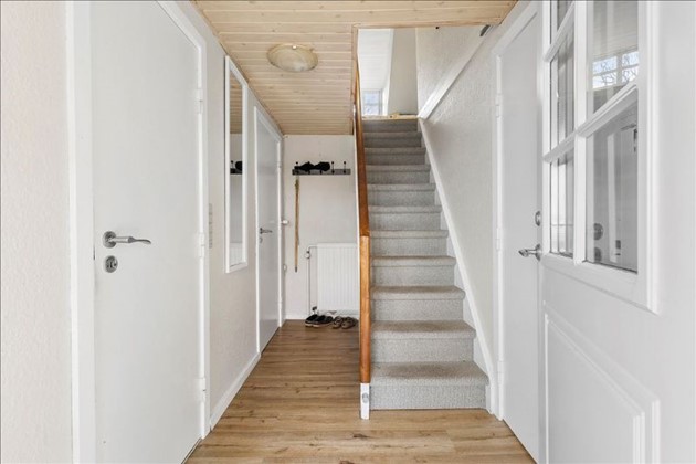 Indretningen af huset omfatter i stueplan et overdækket indgangsparti, der fanger morgensolens stråler og havudsigten. En indbydende entre med trappe fører op til første sal, og på stueetagen findes også et stort og indbydende køkken/alrum. Køkkenet er åbent mod stuen, som har både spiseplads og et hyggeligt opholdsområde med brændeovn. Der er adgang til gårdspladsen fra både køkkenet og et praktisk bryggers, der inkluderer moderne faciliteter som vaskemaskine og tørretumbler.