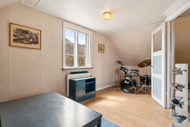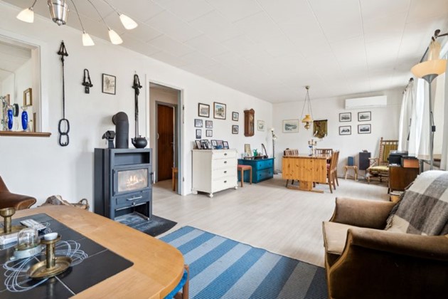 Køkkenet er et centralt element i huset, og det er indrettet med en hyggelig spiseplads og en serveringsluge til stuen. Denne detalje skaber en sammenhængende og indbydende atmosfære, der forstærkes yderligere i den rummelige stue. Stuen byder på masser af plads til både bløde møbler og et spisebord, hvilket gør den til et perfekt sted for afslapning og samvær.