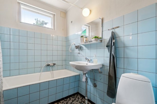 Kælderen i huset rummer også et badeværelse, hvilket giver ekstra plads og funktionalitet.