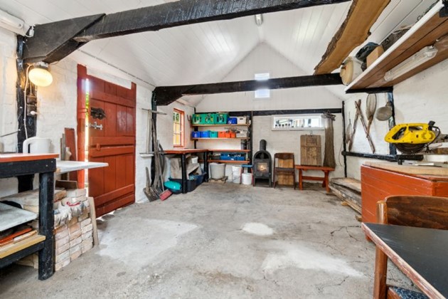 Huset, som har tre værelser og en kælder, er yderst velholdt. Derudover er der en nydelig udhusbygning, der også er blevet sat fint i stand.
