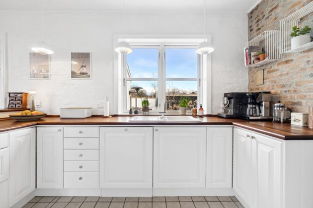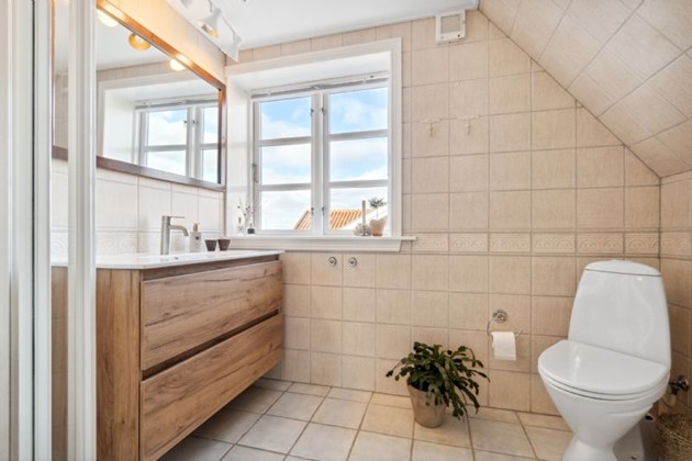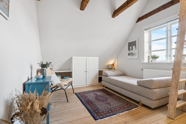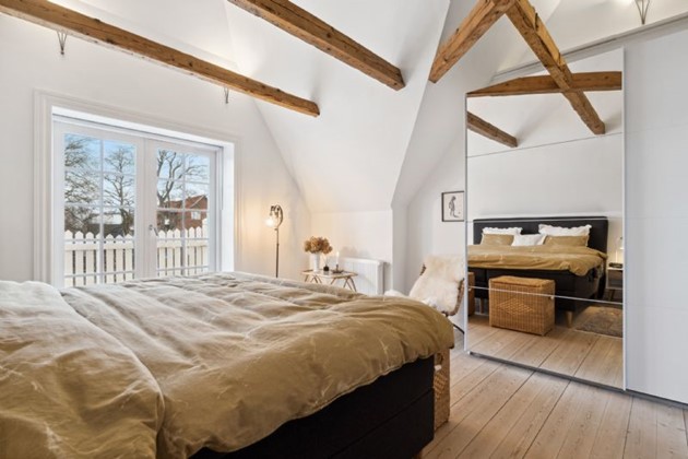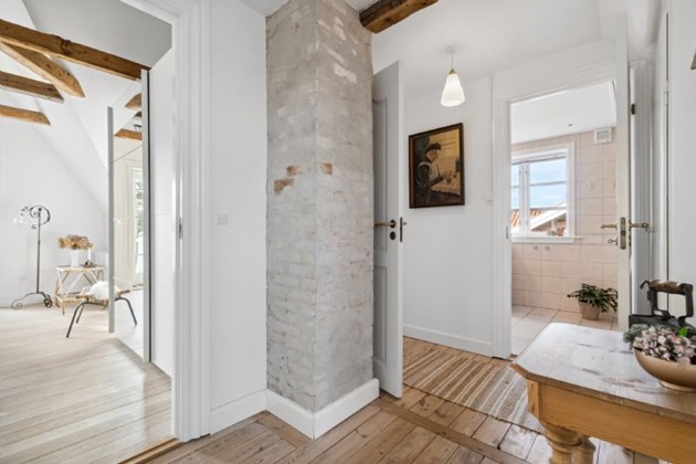 Førstesalens charmePå første sal venter et repos med rigelig skabsplads, tre værelser og et badeværelse. De to hovedværelser præsenterer sig med imponerende lofthøjde, synlige bjælker, plankegulv og hems, hvor det ene værelse har direkte adgang til en balkon og den fortryllende udsigt. Desuden findes et yderligere værelse med kvist. Badeværelset er elegant indrettet med en rummelig bruseniche og skabsarrangement, der fuldender det luksuriøse præg.