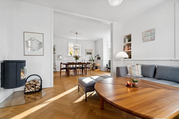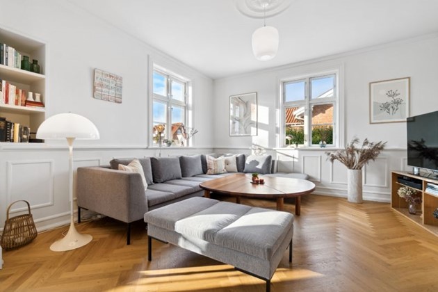Elegance på stueplanVillaens stueplan byder velkommen med en imponerende hall, hvorfra en smuk trappe fører op til førstesalen. To stuer, et køkken-alrum, et bryggers og et toilet udgør de øvrige rum på denne etage. Her er der højt til loftet, smukt udførte paneler, stuk, en karnap samt det fortryllende sildebensparketgulv, der fuldender rummene. Et brændeovn tilføjer både hygge og varme til denne elegante bolig.