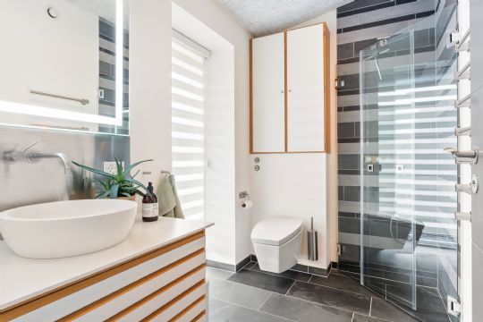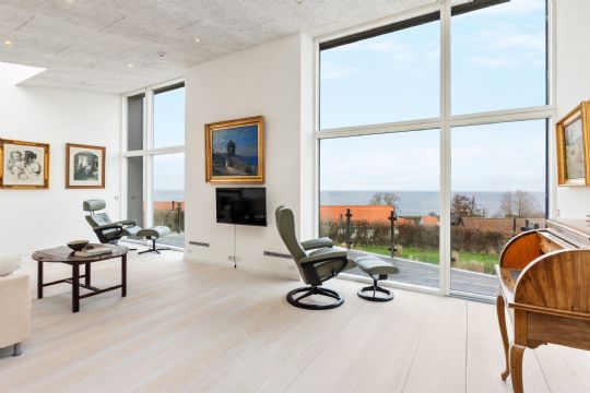 Køkken-alrum og stue fungerer som naturligt samlingspunkt, og terrasserne ligger i direkte forlængelse af opholdsrummene. Den let hævede stue giver frit udsyn mod Østersøen og adgang til altanen, hvor udsigten sætter rammen om opholdet.